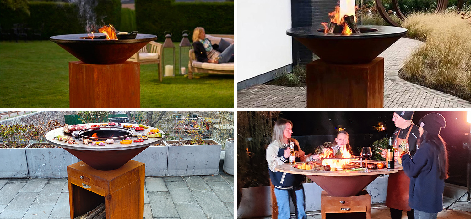 The Corten Round BBQ Grill and Base is crafted from 3mm weathering steel, developing a protective rust patina over time for both outdoor aesthetics and durability. The 10mm carbon steel cooking ring supports high-temperature plancha and teppanyaki cooking, meeting the versatile culinary needs of large round barbecue grill users.